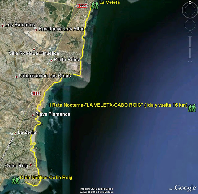 Partimos desde la urbanización de "La Veleta" en Torrevieja, y continuamos hacia "cala Ferrís", que es uno de los pocos pulmones costeros que existen a día de hoy en la costa blanca, a poco más de 1 Km llegamos a "Punta Prima" para abandonar el término de Torrevieja y pasar a tierras Oriolanas donde visitamos "Cala de la mosca", "Playa Flamenca", "La Zenia", "Cala Capitán" y por último "Cabo Roig", que junto a su club naútico descansamos para reponer fuerzas y volver de regreso al lugar de donde partimos, en "La Veleta".